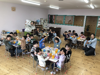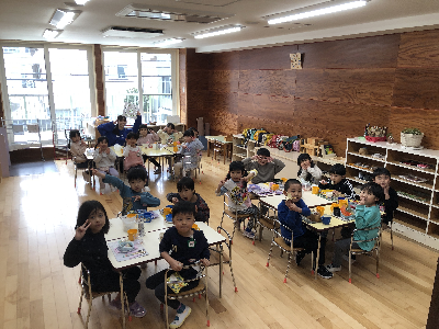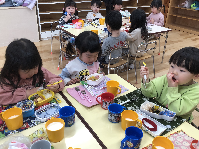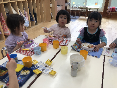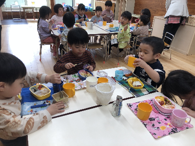 お家の人に作ってもらったお弁当は特別美味しいです!みんなもにっこり。