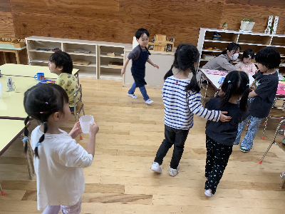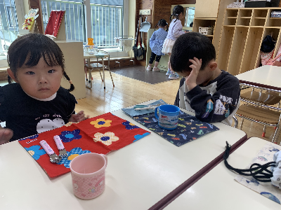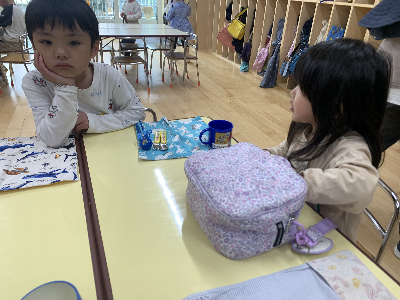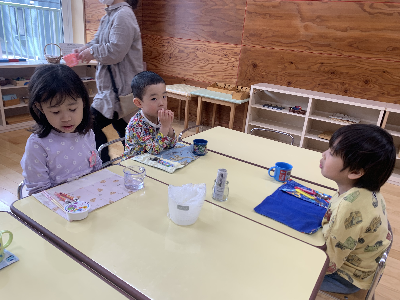 給食の準備をしながら「おなかすいた~!」「早く食べたいな~!」とうきうきの子ども達です。