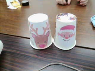 まずは、紙コップに各自、思い思いの絵を書いたり、色紙やサンタクロースのイラスト紙を