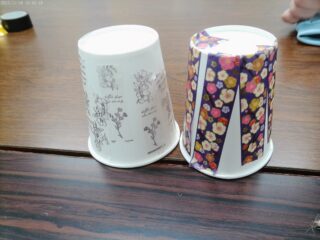貼ったり、マスキングテープで装飾したりと、オリジナルの紙コップが出来上がりました。