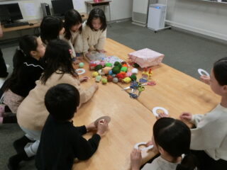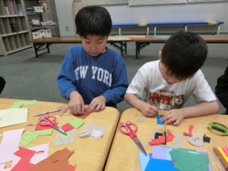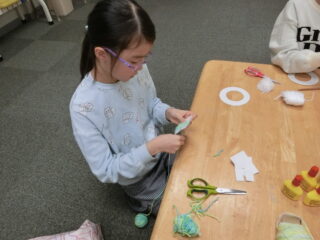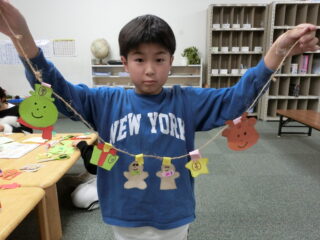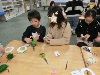 子どもたちに選んでもらい、ガーランド作りとリース作りの2グループに分かれて作業しました。