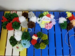 好きな色の毛糸を使い、ボンボンを何個か作りリースにしていきます。