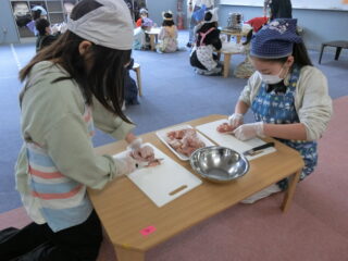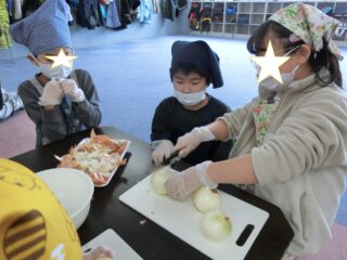 3年生以上も2~3人のグループに分かれて、じゃがいも、にんじん、玉ねぎ、肉を切るメンバーに分かれてもらい作業してもらいました。