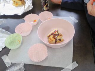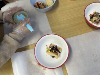 焼き上がった後はチョコソースとトッピング材料を使ってチョコパイのトッピングをしました♪