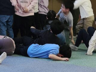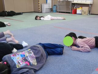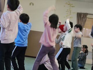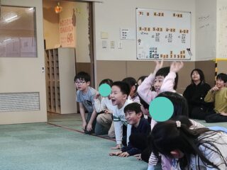 次は「言うこと一緒、やること反対」です。先生が「前」と言うと、皆も「前」と言いながら、後ろへ