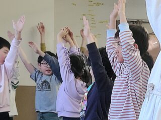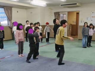 先生が「言うこと一緒、やること一緒」「右」と言うと、皆も「右」と言いながら右に移動します。